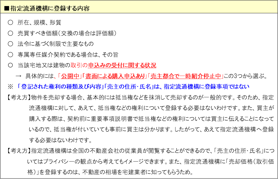 【考え方】物件を売却する場合、基本的には抵当権などを抹消して売却するのが一般的です。そのため、指定流通機構に対して、あえて、抵当権などの権利について登録する必要はないわけです。また、買主が購入する際は、契約前に重要事項説明書で抵当権などの権利については買主に伝えることになっているので、抵当権が付いていても事前に買主は分かります。したがって、あえて指定流通機構へ登録する必要はないわけです。
