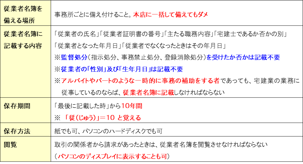 従業者名簿は、従業者名簿を最終の記載をした日から10年間保存しなければなりません。よって、本肢は「5年間」が誤りで、正しくは「10年間」です。